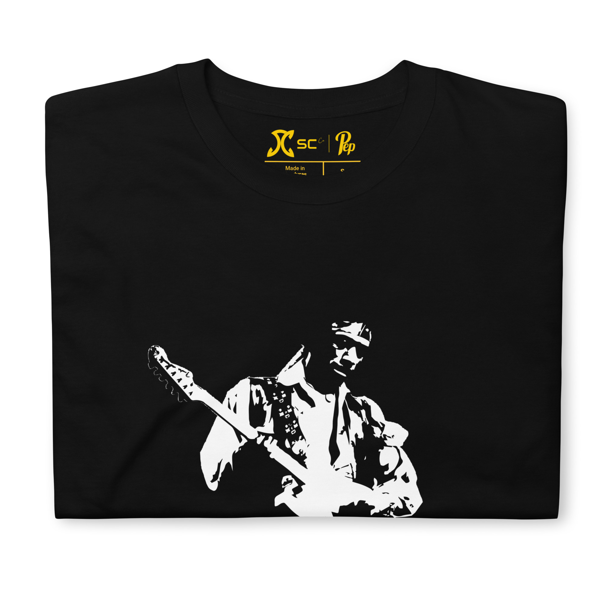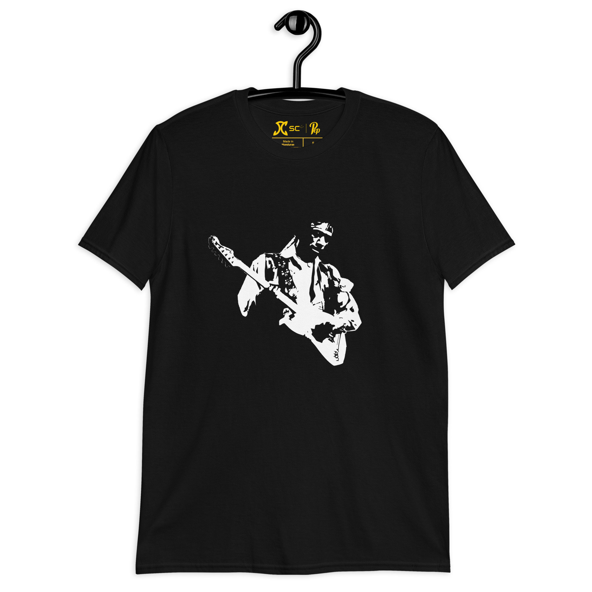 Exprimez votre passion musicale avec notre t-shirt orné d’une illustration d’un guitariste légendaire. Parfait pour ceux qui vivent au rythme des cordes et des mélodies.